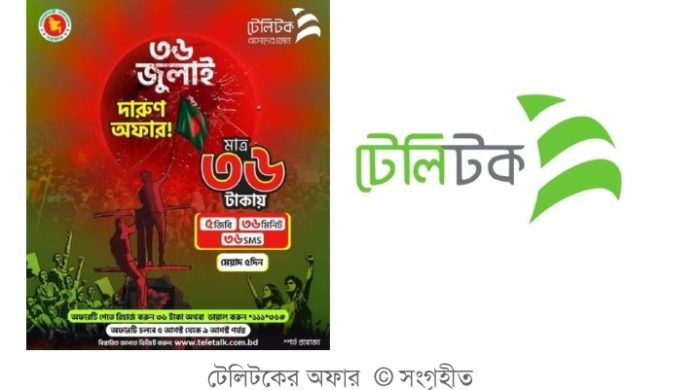 স্বৈরাচার শেখ হাসিনা সরকারের পতনের স্মরণে ৫ আগস্ট, যা ‘৩৬ জুলাই’ নামে পরিচিত, সেই দিনকে কেন্দ্র করে বিশেষ অফার চালু করেছে মোবাইল অপারেটর টেলিটক। জুলাই ও আগস্টজুড়ে চালু থাকা এই